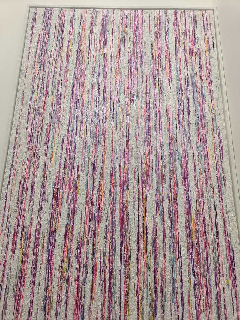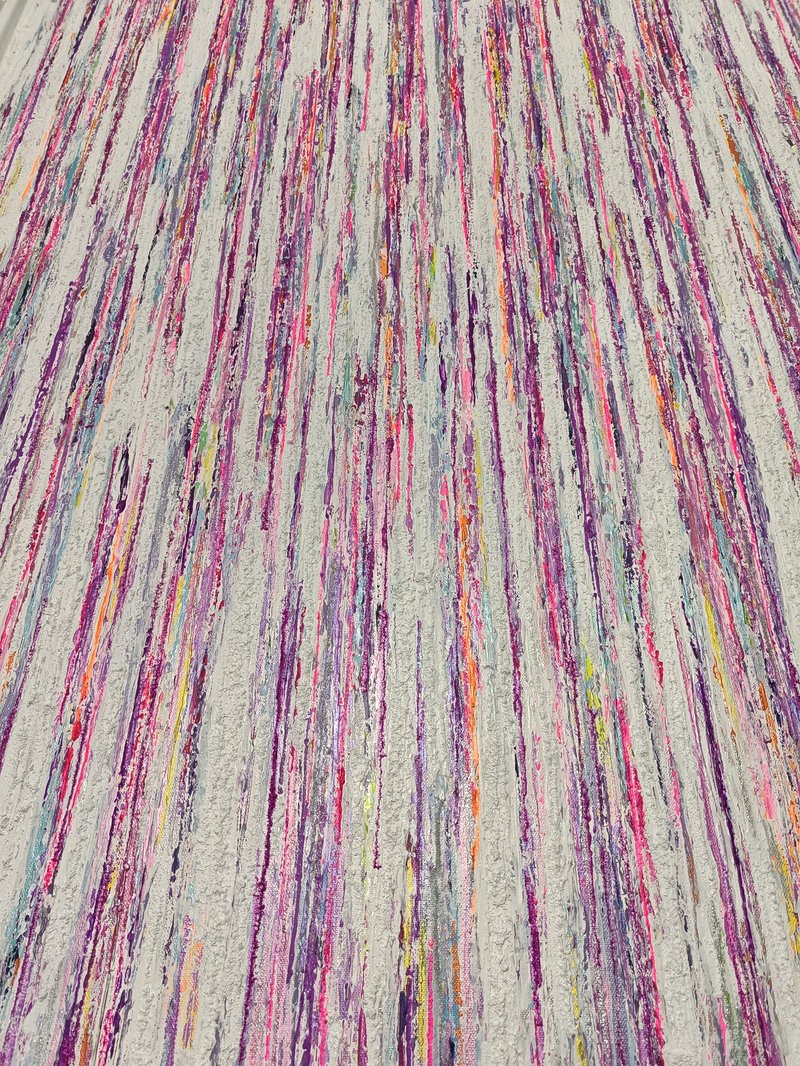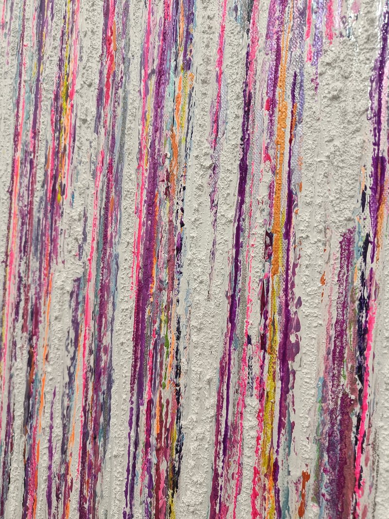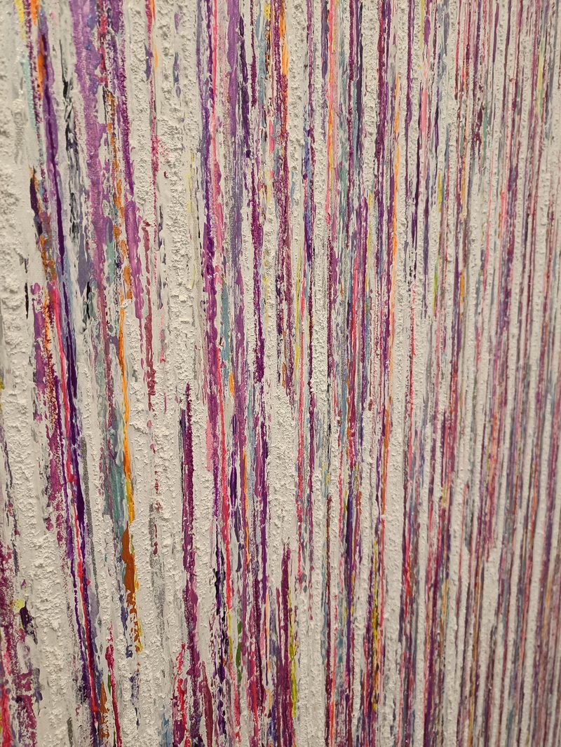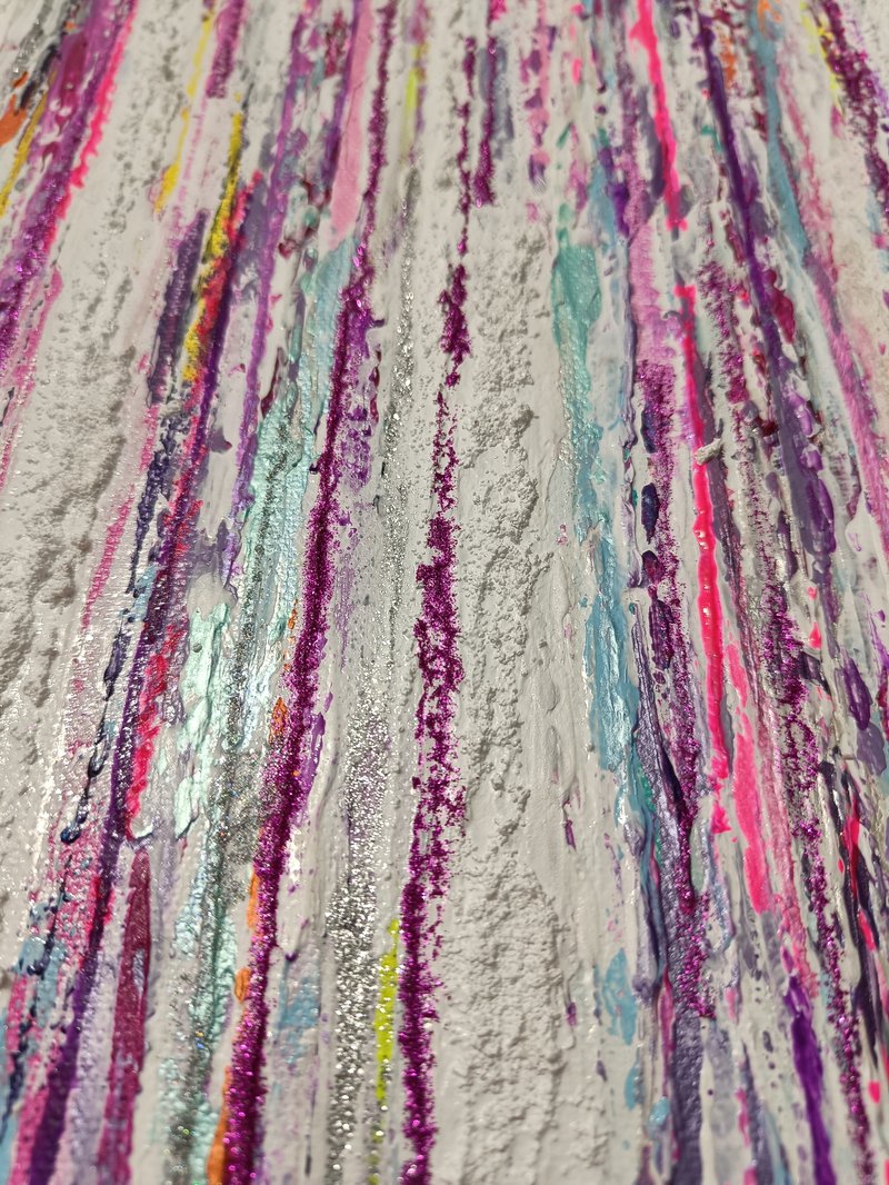 First painting of my collection. Textured acrylic painting. Light reflecting metallic and pearl colors. Changes colors depending on source and brightness of light and angle of viewing. Created for my tall staircase wall. Not for sale.