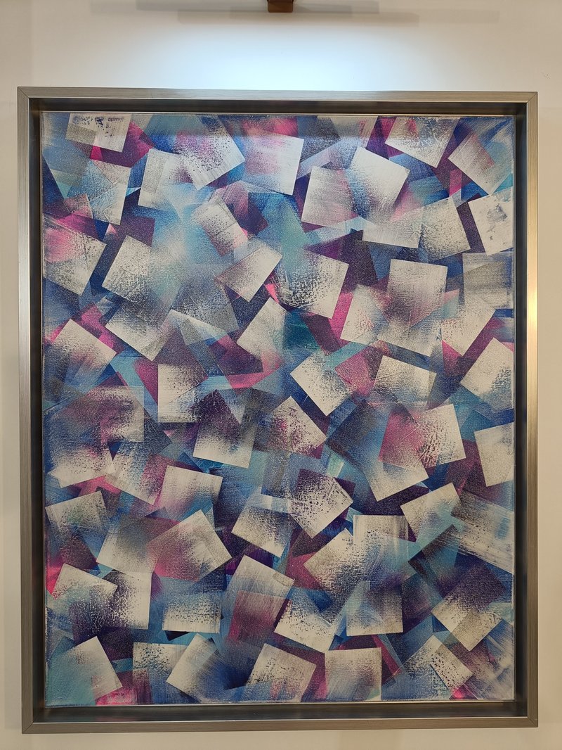 Acrylic painting with settle shimmering top layer of fine iridescent glitter.