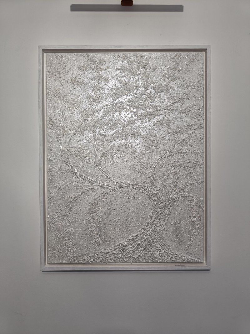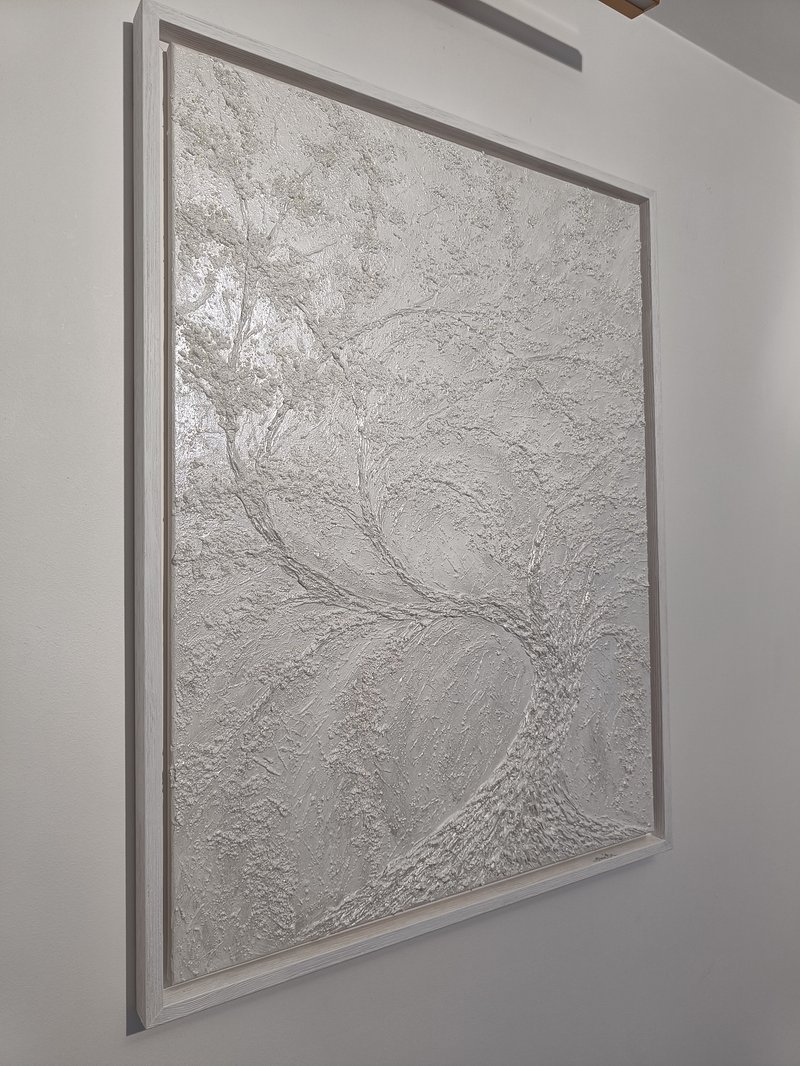 Textured acrylic multimedia painting. White back space and tree trunk is highly light reflecting iridescent color that creates light emitting effect even in very dim light. Textured bloom has a top layer of fine iridescent color changing glitter that creates very settle shimmer from some angles of viewing depending on light source and brightness. It changes color from very settle light green to rose gold.