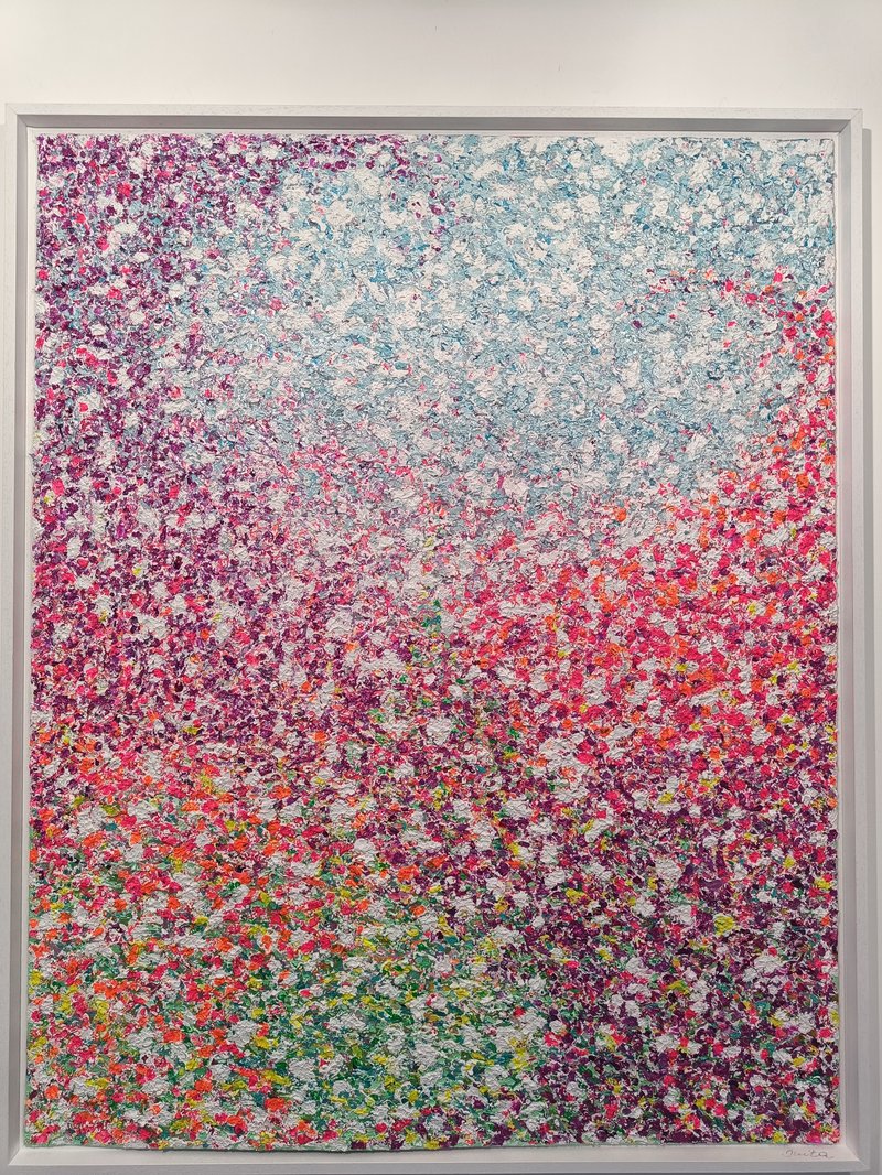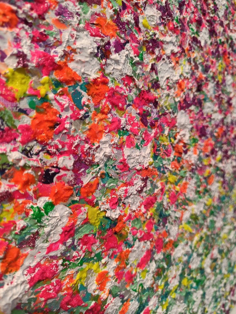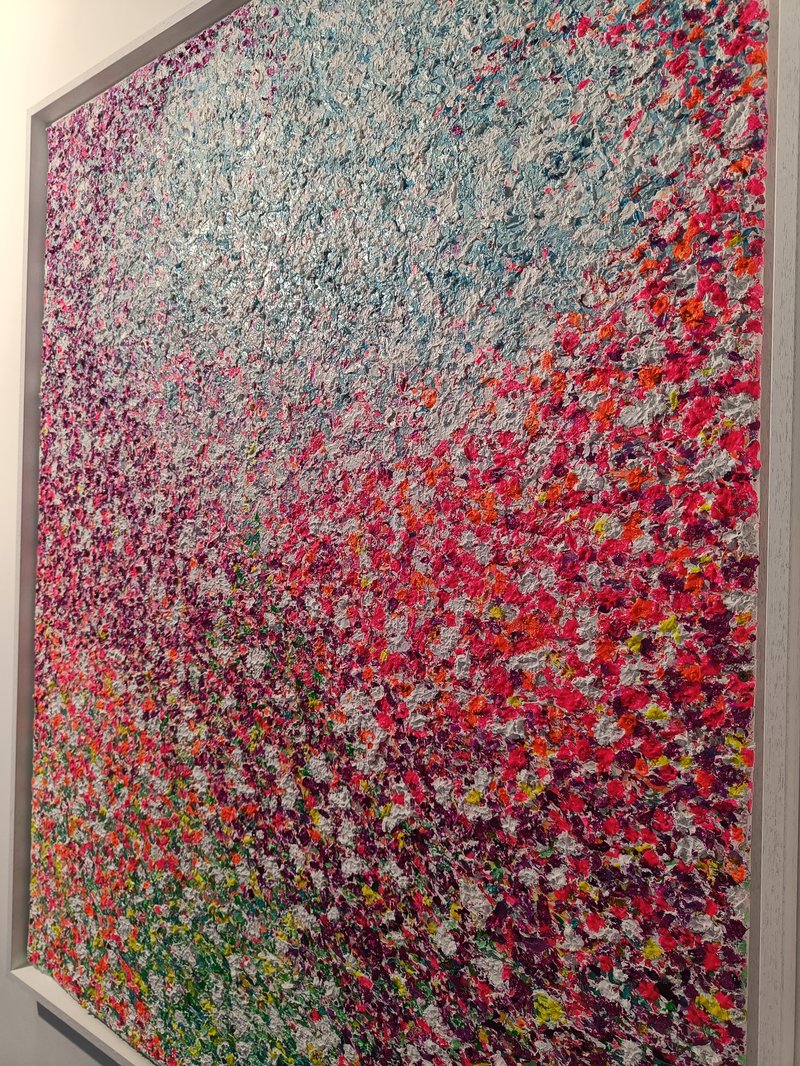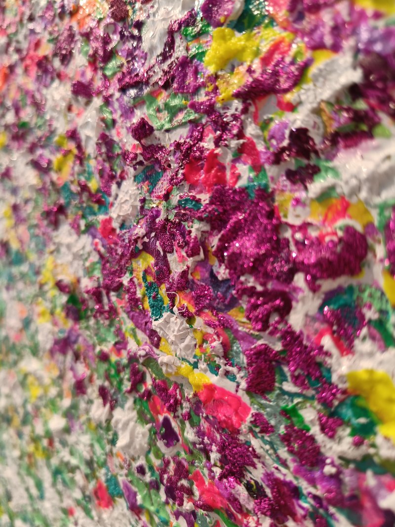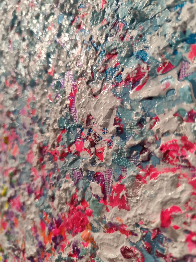 Textured acrylic multimedia painting. Light reflecting metallic and pearl colors and ultra fine glitter texture colors create settle shimmer depending on source and brightness of light and angle of viewing.