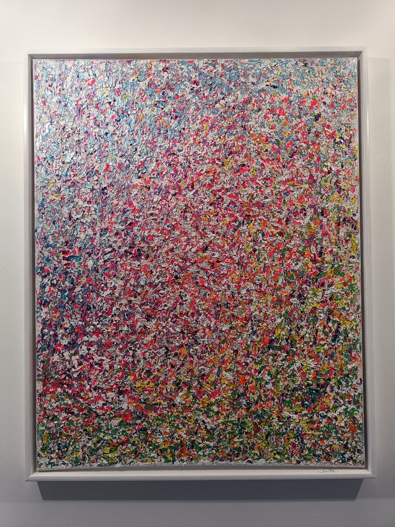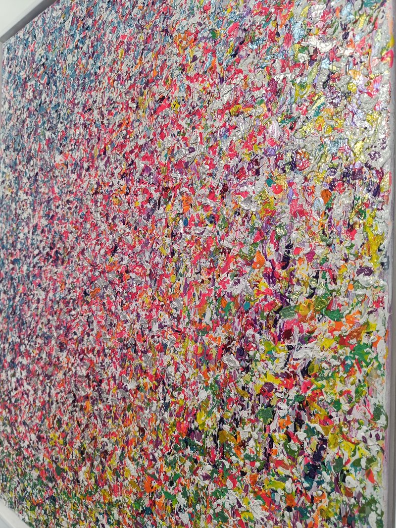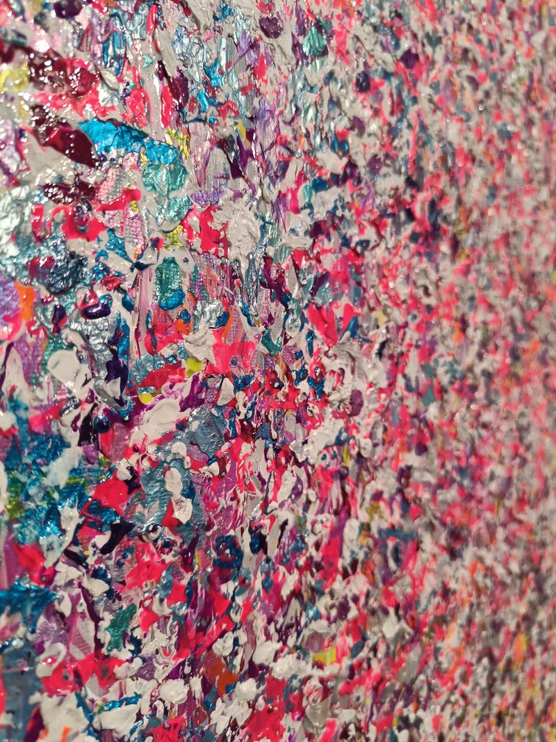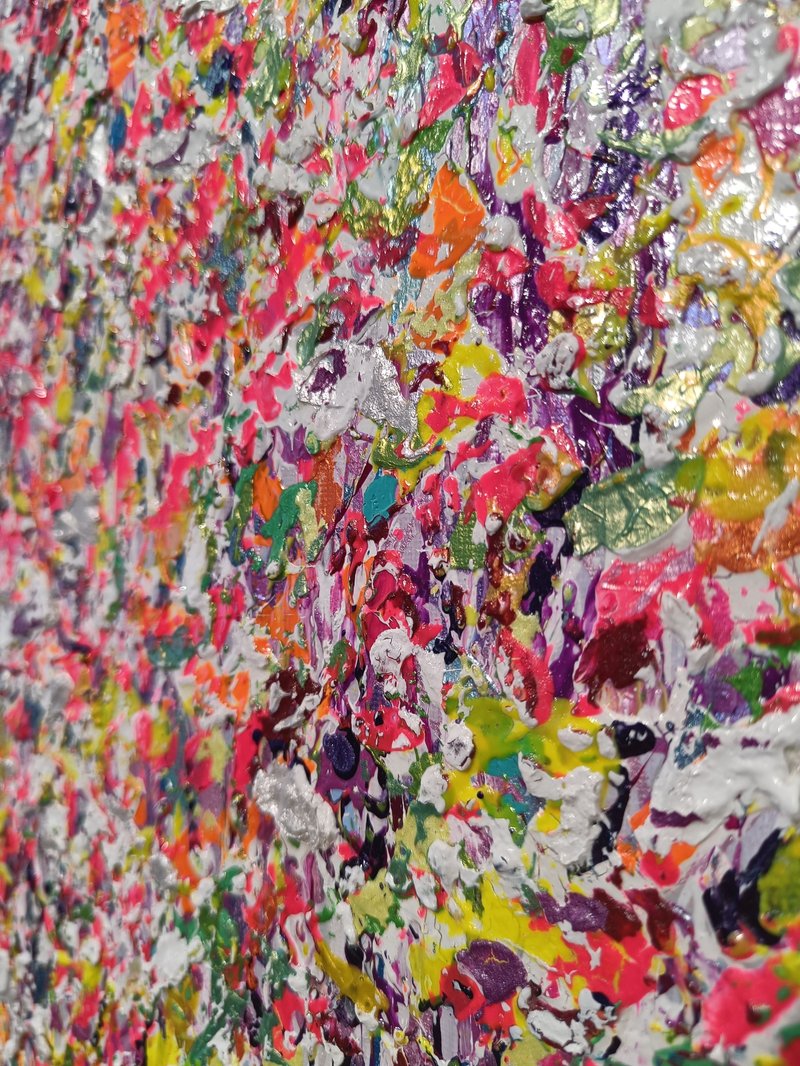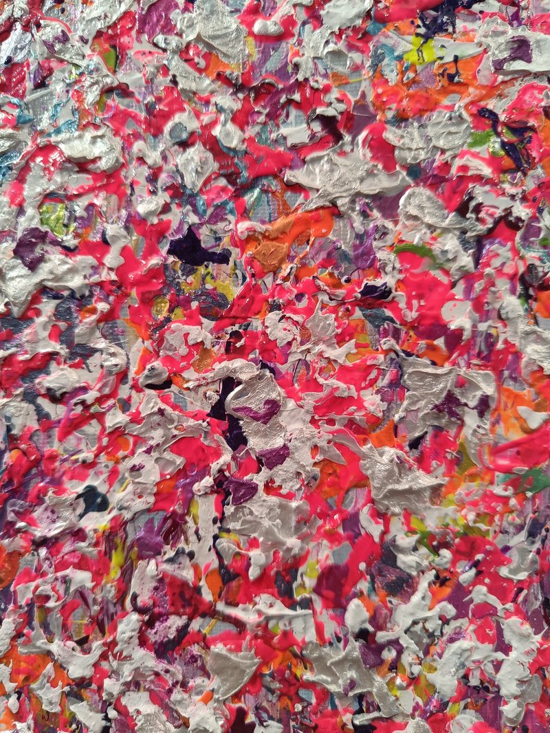 Textured acrylic multimedia painting. Light reflecting metallic and pearl colors and fine glitter colors that create very settle shimmer depending on source and brightness of light and angle of viewing.