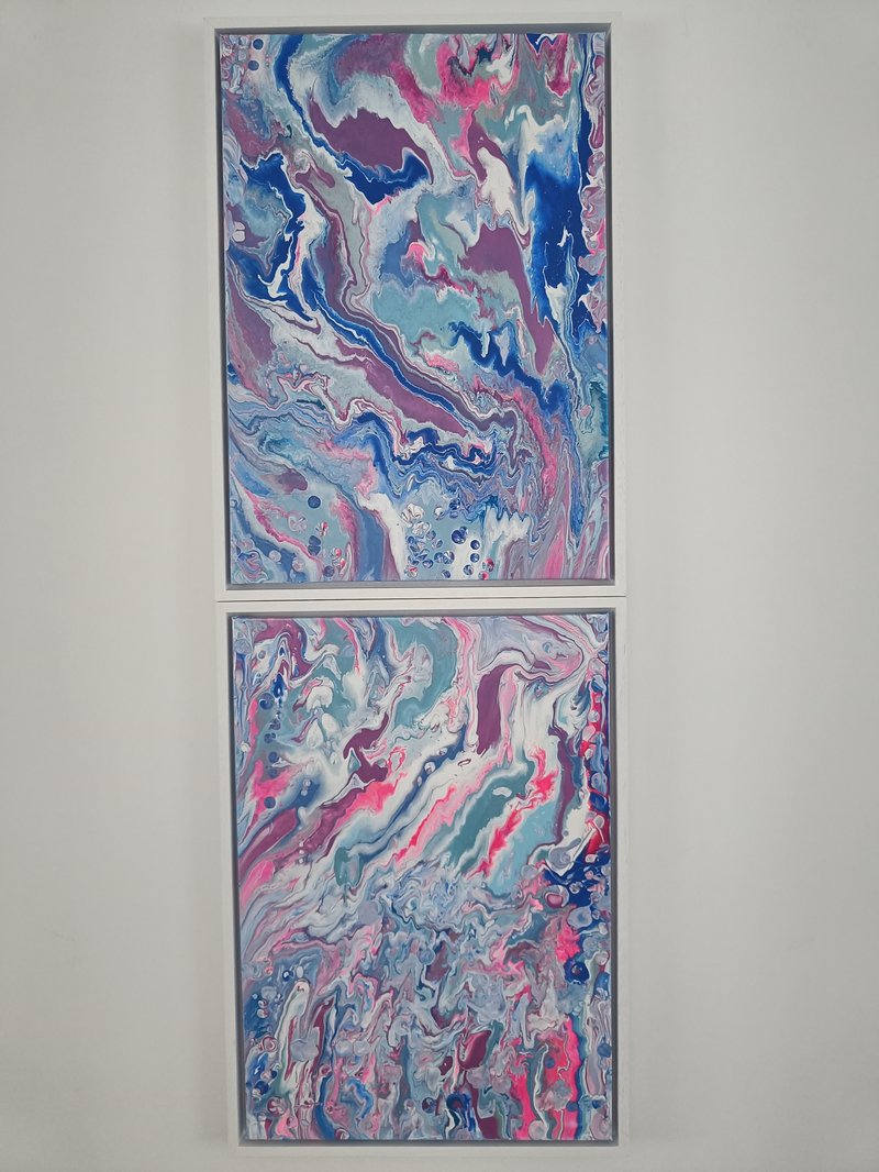 Acrylic paintings. Liquid paint pour Technic. Pearl and metallic colors. Gloss finish. Created for tall an narrow space.
